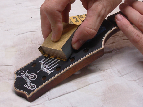 After the stain is dry and the bindings are all scraped of any color bleed, clear lacquer is applied. When enough coats have been sprayed, it sits overnight to fully dry. Then it is lightly sanded and more clear coats are applied.